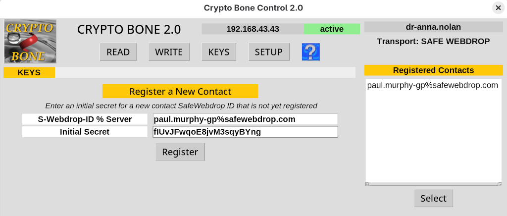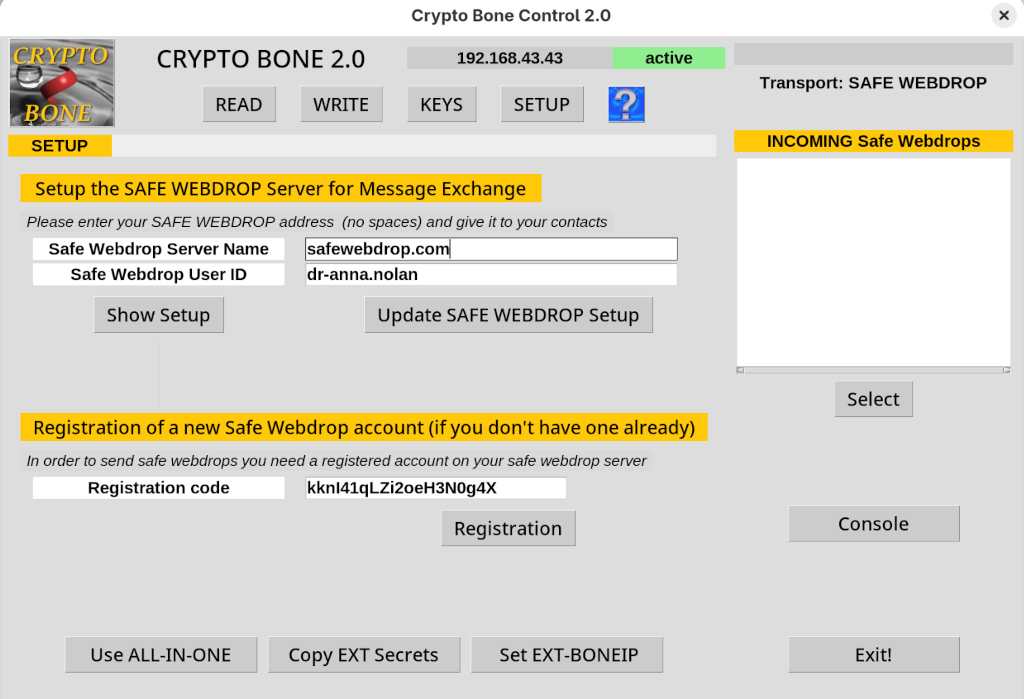 If you don't want to use an external device, that's all you need to install. Type "cryptobone2" in a terminal window and enter your login password on request. Now you're ready for secure communications after you have registered your own safewebdrop address with a server.